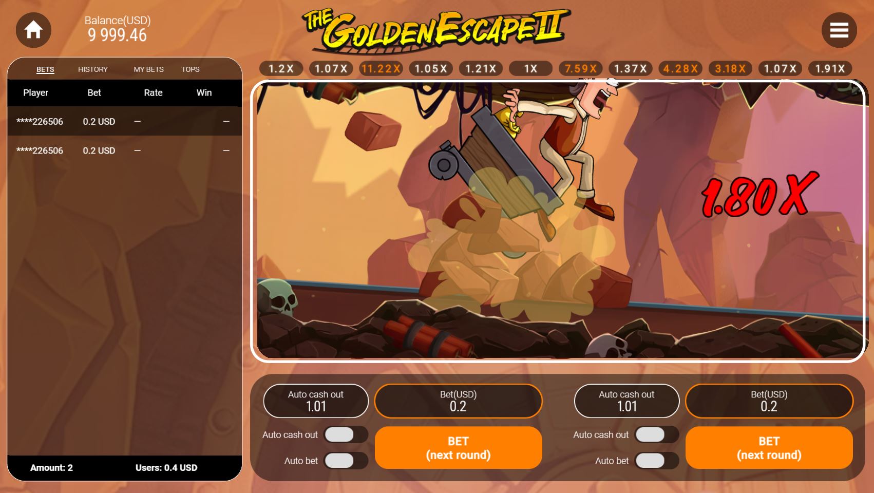 The gameplay cycle is straightforward. First, you set your bet amount using the controls on one or both betting panels. Second, you press the “BET” button to confirm your stake for the next round. Once the round starts, the button changes to “CASHOUT.” Your task is to click “CASHOUT” before the animation ends in a crash. If you succeed, you win your bet multiplied by the value on screen at the moment you clicked. If you fail, your stake for that round is lost. The history of recent multipliers is displayed at the top of the screen, which can help inform your strategy for the The Golden Escape 2 demo play.