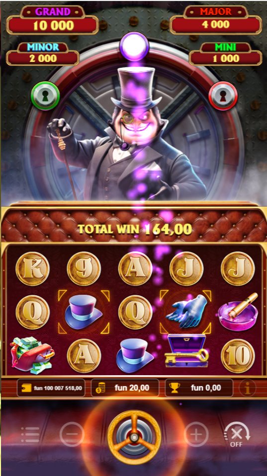 The Purple Vault Respin, activated via the Purple Key lock, also starts with 3 respins and carries over initiating Key symbols. Its distinguishing element is the introduction of the special “Banker” symbol – the game’s main character icon. When the Banker symbol lands on a reel during this feature, it applies a random multiplier to the values of any Key symbols also present on that same reel. The game rules specify this multiplier ranges from 2x up to 10x, adding a significant boost to the potential value collected from those keys. Similar to the Red Vault, landing any symbol resets the respin counter back to 3. Completing the “GRAND” word collection awards the corresponding extra prize. The interplay between landing valuable Key symbols and the Banker symbol on the same reel simultaneously is the key to maximizing returns in this particular feature. The round concludes when no new symbols land on a spin.